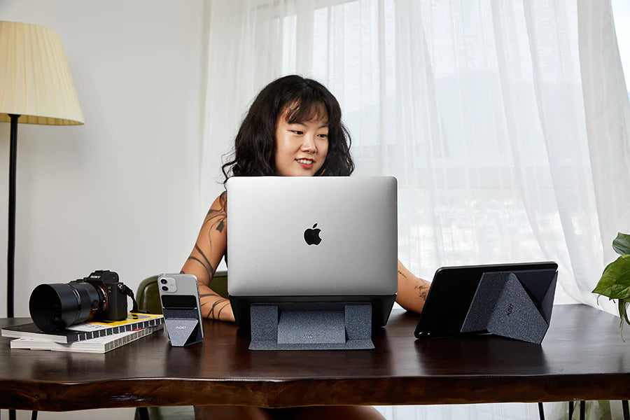 It sits flush on your laptop with removable, residue-free adhesive, so you won't forget to carry and have your laptop screen at eye-level to work in comfort.